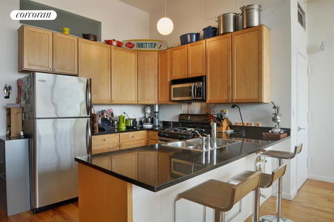 *MODERN LOFT* This 13ft condo loft can be used as a 1 bedroom and is for Sale at The Chocolate Factory. This renovated LOFT boasts a unique layout with tons of LIGHT, WINDOWS, VIEWS and STORAGE. This LOFT includes built-in surround sound, a HUGE sleeping platform, custom sliding door walk in closets, STORAGE under the loft, motorized blinds, new energy efficient double pane windows with UV coating, a renovated bathroom with wooden floating cabinetry and kitchen with stainless steel appliances. This LOFT has one of Brooklyns ONLY green roof decks with actual crickets and butterflies! A glass enclosed ROOF DECK GYM with Manhattan (Freedom Tower & Empire State Building) and Brooklyn skylines can be reserved for events. Other amenities include a jacuzzi, central air conditioning and heat, a washer and dryer, hard wood floors and granite countertops. The G train to Myrtle-Willoughby is 2 and a half blocks away and buses surround the building to get you to the A, C, F, Q, N, R, 2, 3, 4, 5, J, M, Z within 10 minutes. Fresh Direct, many organic/health food stores, and restaurants deliver to the building along with many other conveniences. Your LOFT is near the YMCA, Fort Greene Park, the post office, grocery stores, Duane Reade, Home Depot, and parking garages. A grocery store and Zipcar garage are right across the street! You are only a few stops from the new Barclays Center, home of the Brooklyn Nets! FHA Approved with an APPROVED 421A 10 Year Tax Abatement until 2022. Apartment Features: East exposure, North exposure, Roof deck, Partial skyline view, Floors - hardwood, Light - excellent, Windows - oversized, Windows - new, Modern kitchen, Renovated bathroom, Storage space, Walk in closets, Great closet space, Washer/dryer, Dishwasher Building Features: Roof deck, Exercise room, Video security, Cable TV ready, High speed internet, Water