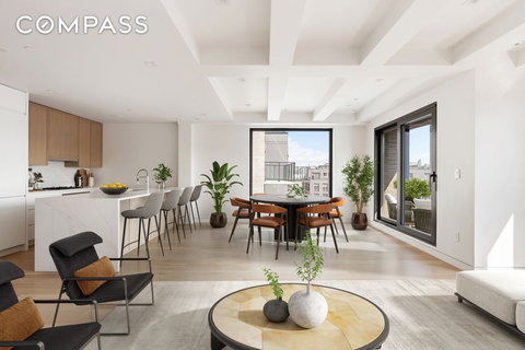 Residence four is a stunning full-floor residence with two private terraces. The kitchen seamlessly opens to the living room and extends to a balcony offering stunning city views. All floors are heated with multi-zoned radiant heat, ensuring comfort in every season, and the recessed overhead lighting with living room dimmers enhances a sophisticated ambiance.