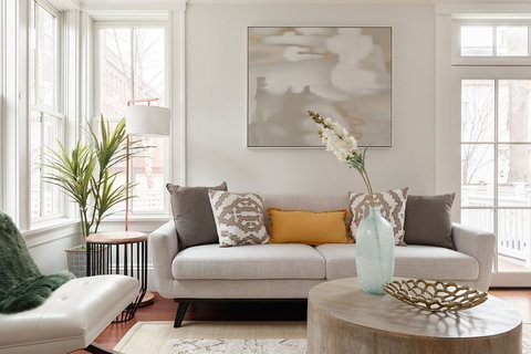 Located in one of Cambridge’s most coveted neighborhoods is this stunning Greek Revival home, tucked back from the street by way of a bluestone walkway. Beautifully reimagined in 2009, this timeless townhouse is punctuated with a clapboard exterior and encircled in sprawling gardens. Thoughtfully designed with an open concept the first floor seamlessly merges living, dining, and kitchen in one sunlit space. A white shaker kitchen with soapstone counters is elevated with sleek, stainless steel appliances. Elegant French doors reveal a private rear deck with bluestone patio and yard. The top floor includes a pair of cozy bedrooms with cathedral ceilings, including a main suite serviced by a luxe bath with overhead skylight. The ground level offers a family room, washer/dryer, storage space, and an exterior entrance. Equipped with central A/C and off-street parking, this light-filled townhouse is situated just blocks from bustling Central Square and a short commute to Harvard and MIT.