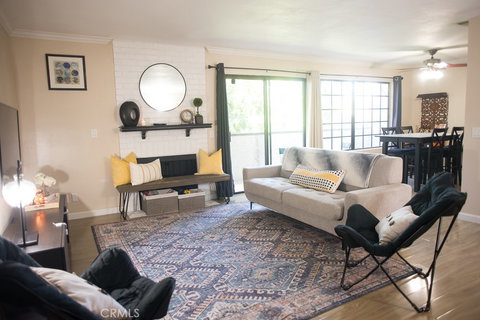 Top level condo in gated complex within fantastic Canoga Park location. Located near world class shopping and dining at Westfield Topanga & The Village. This top floor unit has 2 bedrooms, 2 baths, in-unit laundry and lots of closet space and storage throughout! Cozy fireplace in living room with updated wood-style flooring. Spacious private balcony with peek-a-boo mountain views. Fully equipped kitchen with gas range stove, refrigerator, dishwasher, and built-in microwave. Large master bedroom with plenty of natural sunlight. Master bathroom with dual vanities. Additional upgrades include a digital thermostat. Well maintained gated condo complex has low HOA dues that covers water, trash, garden maintenance, AND earthquake insurance! Lovely pool and spa inside complex. Two tandem covered parking spaces w/ LARGE adjacent private storage room. Plenty of guest parking. Condos inside this quiet complex rarely hit the market -- won't last long!