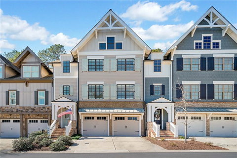 Beautiful 3-story luxury townhome with an elevator, discreetly nestled within the coveted Overlook at Sixes Community. Meticulously maintained townhome showcases gleaming hardwood flooring, 10-foot ceilings on the main level, exquisite crown molding, and an array of upscale finishes that enrich every corner. The open-concept floorplan is ideal for family gatherings that flow easily from the kitchen to the family room centered by a gas fireplace. The large formal dining room sets a scene of refined splendor, making it ideal for hosting grand dinner gatherings and room for your largest table setting.The chef's kitchen is a culinary masterpiece, featuring custom cabinetry, granite countertops, tiled backsplash, a gas cooktop, stainless convection wall oven and convection microwave, stainless dishwasher, matching stainless refrigerator and a generously sized center island with breakfast bar area with stools, all harmoniously complemented by hardwood floors throughout entire main area. From the kitchen and family room you can step onto the back deck screened porch with room for a large table and sitting area looking at wooded green space. Home features four spacious bedrooms each w/its own full bathroom. On the main level, you'll also find guest bedroom complete with a full bath and a spacious closet. Upstairs, the primary owner's suite is a sanctuary, with a comfortable sitting area, a large walk-in closet. The primary bath features spacious double sink vanity, a rejuvenating soaking tub, and a tiled shower featuring a convenient seating bench. This spa-like bathroom will not disappoint and creates a warm relaxing area to unwind at the end of your day. An additional bedroom, en-suite bath, loft area, and a dedicated laundry room also await you on the third floor, ensuring that this townhome accommodates your every need with sophistication and style. The wide staircase makes this home feel grandiose. The terrace level has been thoughtfully finished to create the perfect in-law or guest suite, boasting a generous media/theatre room, a comfortable guest bedroom, with\full bathroom. A kitchenette offer sink, cabinets, stove & refrigerator. In addition to this a walk-out covered patio with epoxy surface and room for additional outdoor space out of the rain. Three miles from interstate & Peach Pass makes commuting easy to Atlanta or the airport. Close to schools, outlet shopping, Lake Altoona and Blankets Creek bike trail. It will not disappoint.