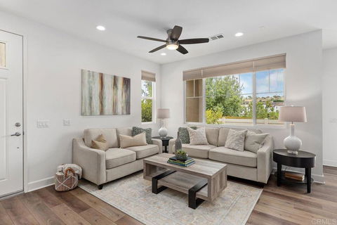 Welcome to this stunning 3 beds, 3 baths,1681 sqft. home nestled in one of the newest planned community developments in Carlsbad. Just a few miles away from Carlsbad State Beach and Carlsbad Village. Walking distance to shopping/dinning. As you enter the home, you will be greeted by a warm brown tone cabinets, white wavy full tile backsplash, and white quartz countertops.The kitchen is a chef's dream, featuring stainless steel appliances, Samsung 5 burners with an indoor grill, center island with seating, quartz counter tops, custom pendant lighting, single sink pull down faucet and a walk-in pantry. The family room offers an Open Floor Plan with ample natural lighting, large windows, stunning luxury wood-like flooring and ceiling fan. The wide glass sliding doors lead to the backyard patio where you will enjoy the views of the tranquil Buena Vista Creek and walking trails. Upstairs, you will find additional linen cabinets, laundry room with a deep sink, two spacious secondary bedrooms, serviced by a split bathroom and water closet. The generous primary suite is seperated from the secondary bedrooms, offering a sitting area, balcony, dual sink area, separate shower/tub, water closet and a walk-in closet. This home also features an expansive 2 car garage with direct access, energy-efficient tankless water heater, EV hook up, and a full home water filtration system. You can enjoy the community beach entry pool/spa with swimming lanes, fitness center with free weights and the latest cardio/ strength equipment, playgrounds, parks, outdoor stacked stone fireplace to relax by and the BBQ area with multiple seating, gated dog park, walking/hiking trails and much more. TOP RATED SCHOOLS ! Hope Elementary is a high performing elementary school with test scores and academic progress. Calavera Hills Middle School perform above average on state exams. Sage Creek High School opened in 2013 boasting stunning architecture on 57-acre site with emphasis on inspirational learning experiences. Rated top 10% of all schools in California for overall test scores. Graduation rated top 5% *According to the Public School Review.