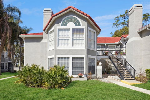 Experience serene living with a truly low-maintenance lifestyle in the heart of Casselberry! Comfortable and Flexible are the words that best describe the layout. TOUR THE HOUSE WITH THE VIRTUAL TOUR LINK. Step inside this ground floor unit to find beautiful bay windows bathing the large living room with natural light. A cozy wood-burning fireplace adds character and charm to the space, as does the elegant tile flooring running throughout the house. (No carpet.) Prepare meals in the open-concept kitchen to serve at the breakfast bar or in the spacious dining area. This house provides plenty of room for entertaining! Start your day out on your screened patio enjoying your morning coffee while listening to birds chirp in the mature oak trees throughout the neighborhood. The house features two large bedroom suites, each with ample closet space as well as their own linen closets. One bathroom has a tiled shower, and the other a tub/shower combo. Forget juggling endless maintenance. The A/C was replaced in 2020, as was the dishwasher. Hunters Chase is a gated neighborhood where the HOA takes care of your water, landscaping, exterior insurance, and the roof (replaced approximately 7 years ago), leaving you plenty of time to cool off in the sparkling pool, exercise in the gym, or connect with neighbors in the clubhouse. On top of that, your vehicle will find shelter under convenient reserved covered parking---just steps from your front door. Situated strategically in Casselberry, you're perfectly connected to major roadways, ensuring seamless commutes around Central Florida, or to enjoy quick errands, great shopping, and some of the best restaurants the region has to offer!