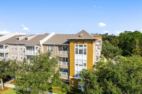 WATER VIEW from your Private Covered Penthouse XL Balcony! Coveted 3 Bedroom, 2.5 Bathroom "Schofield" Floor Plan over 2,000 Square Feet. Foyer leads to Flex Room/Home Office with Closet plus Modern Powder Room. Large Dining Room with Tray Ceiling and all LED Canned Lighting throughout. All floors are Luxury Vinyl throughout except Bathrooms with upgraded Tile. Dining Room has French Door to your Private Balcony. Large open Living Room with expansive windows (electric shades) making this room Light & Bright. Plantation Shutters in Bedrooms and Bathrooms. Kitchen features: Quartz Counter tops, 42" Cabinets, Upgraded Stainless Steel Appliances, Closet Pantry plus Eat-in Breakfast Nook. Split Bedrooms - Primary En Suite Bedroom has XL Walk-in Closet and Bathroom features: XL Shower and Modern Dual Vanity Sinks. Bedrooms 2 & 3 share a Jack & Jill Bathroom. Inside Laundry Room (Washer/Dryer are negotiable). Storage Room is located next to the unit. 1 Car Garage is assigned to the Condominium. Enjoy the Artisan Club Amenities: Clubhouse, Resort Style Pool & Spa, Fitness Center, Billiard Room, Restaurant/Bar, Outdoor Kitchen and Banquet Room. Club has many resident special events on their calendar. Over 26 miles of walking/biking trails throughout the community plus Downtown Celebration Restaurants, Shops, Banks and MORE! Check out the Visual Tour and 3-D Floor Plan!