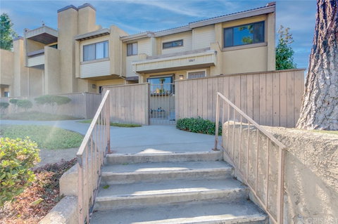 In a large complex, right off Topanga Canyon Blvd., and minutes away from shopping, dining, and entertainment sits a 1,436 sqft, 3-bedroom, 2-bathroom townhouse, move in ready for the next lucky buyer. Steps that lead to the front yard of the home, with room to set up for lounging, and upon entering you are greeted with laminate flooring throughout the spacious room. An easy flow to the chic and modern looking kitchen that features mahogany toned cabinetry, styled with lengthy countertops, mosaic looking backsplash and built-in stainless-steel appliances. The breakfast bar area, that can be set up with barstool and coupled with a fireplace in the living room, gives the whole space the complete and perfect look for entertaining guests. Ascend to the second floor with a set of stairs connecting a common hallway bathroom with 2 bedrooms, one of which has a built in closet and both of which have beautiful laminate flooring throughout. Another set of stairs that lead to the third level, leading to the primary bedroom that features carpet flooring, has a built-in fireplace and an en suite bathroom. Home includes an attached 2 car garage with direct access from the lower level and a laundry area with a washer/dryer hookup.