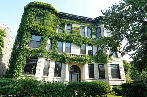 Fabulous renovated Graceland West classic vintage greystone. Bright South facing unit with high ceilings, newer wood floors, natural oak trim, two stunning original built-ins. Huge separate Living and Dining rooms. French doors to front bedroom make it perfect for an office. Extra large kitchen with all stainless appliances and granite counters leads to a private deck. Gorgeous wood burning fireplace. Tons of closets. In-unit washer/dryer, Brand new AC and high efficiency furnace. Common outdoor space with table/chairs. Large gated storage room in the basement plus common storage. Transferable exterior parking available across the street ($100/month). Shows great!