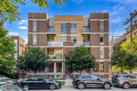 This stunning 2-bed, 2-bath condo in Logan Square/Avondale features a PRIVATE roof deck directly accessible from the kitchen, living, and dining area-a rare find in Chicago! Enjoy the convenience of not having to carry everything up a flight of stairs. The private roof deck, located over the garage, is a green thumb paradise. The condo boasts three outdoor spaces: two balconies and a large deck measuring 19 x 33 feet. The large, open floor plan includes a kitchen equipped with Viking and Bosch stainless steel appliances, white quartz countertops, a wine fridge, an under-counter microwave, seating for four, and a spacious pantry. The living room is bright and open, with ample natural light and windows, and enough room for a dining table. The primary bedroom is generously sized, accommodating a king-sized bed and an entire office setup, with a large walk-in closet. The primary bathroom features heated floors, extra storage, a walk-in shower with handheld and rainfall showerheads, and a dual vanity. The second bedroom is spacious with a built-out closet featuring drawers. Second bath has tub with shower combo. Hardwood floors run throughout the condo. Additional amenities include an elevator, a garage space with extra storage, conveniently located close to the elevator, plus a common area roof deck on main roof. The neighborhood offers a stunning river walk with river access, and is close to the expressway, Midtown Athletic Club, Costco, Aldi, Jewel, Marianos, Home Depot, Home Goods, and more. Agent owned.