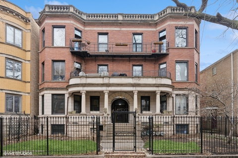 This stunning & spacious 4-bed, 3-bath duplex down condo blends vintage charm with modern convenience on a quiet, tree-lined cul-de-sac in the city. With 2,200 sq. ft., enjoy an expansive layout featuring two living spaces, a separate dining room, and a breakfast room. The formal living room boasts a fireplace and opens to a charming limestone front porch, which also serves as a private entry, while the dining room showcases a stunning beamed ceiling and original built-in hutch. The chef's kitchen offers a plethora of cabinetry, high-end stainless steel appliances, and an attached breakfast nook. The primary suite features a private bath, and all bedrooms are generously sized. The lower level impresses with a spacious family room, fireplace, built-ins, and plenty of storage. Additional perks include side-by-side laundry, two efficient furnaces, and deeded garage parking. Prime location near the lake, parks, and the Red Line. A truly rare find!