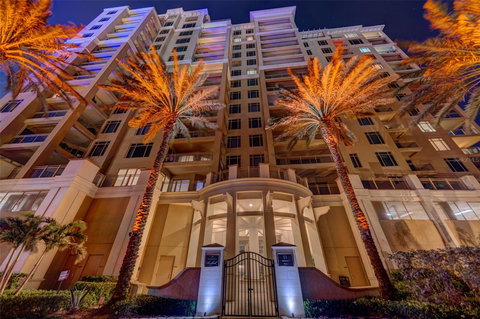 A masterful achievement of concept and design, this coveted residence showcases exquisite craftsmanship & cutting edge design, western breezes with breathtaking direct Gulf of Mexico views. Seamlessly integrated indoor/outdoor living with floor-to-ceiling glass doors, luminous open living spaces, 3-private terraces, direct Gulf views from most every room. This bright, open floor plan boasts the "wow" factor, an enormous great room, crown molding, espresso stained mirrored wall panels, architectural LED lighting, artist niche, travertine floors, walls of sliding glass doors, plus angular and open walls. Formal dining. Conducive to today's lifestyle with a culinary kitchen: quartz top counters, storage drawers, Wolf appliances, low-bar center island, 3-pendant lights, 4-top dinette, walk-in & wall pantry's, subway tile backsplash. Adjacent family room with access to 2-private covered balconies. Wine Room : Classic Sub-Zero Wine Storage. Owner's retreat accesses 2-private terraces both overlooking the Gulf of Mexico. Sumptuous her & his master bathrooms. Hers: marble floors, curved glass shower, jetted tub, 2-sink high gloss cabinets, make-up vanity, huge walk-in closet, water closet. His: glass door walk-in shower, sink vanity, walk-in closet. Secondary master suite: private balcony, crown molding, walk-in closet, mini bar & refrigerator, walk-in closet, bath en-suite: marble floor, high gloss vanity, glass door walk-in shower. Powder Room. Each additional bedrooms have travertine floors, crown molding, balcony access, walk-in closets, bathrooms en-suite. Laundry room: washer & dryer, utility sink, cabinet & closet storage. The Sandpearl offers luxurious coastal lifestyle which includes 24-hour concierge services, beachfront resort pool, poolside cabanas, spa, state-of-the-art fitness center, steam/sauna, secured parking in a pet-friendly environment. Cabana: #18, 2-parking spaces: #293, #295 & storage room #214.