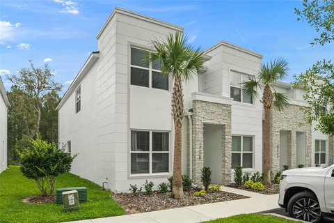 Whether you’ve been searching for your next investment opportunity or primary residence, the search is over! This beautiful, modern 4-bedroom, 3-bathroom pool townhome is impeccably maintained and practically brand new in the quiet neighborhood of Hidden Forest at Silver Creek! Through the front door is the perfect guest bedroom with an ensuite tucked up at the front. Further into the home you’re welcomed into your open concept living room, dining, and kitchen. This immaculate kitchen offers sleek cabinetry, waterfall edge countertops, stainless steel appliances with breakfast bar seating. This townhome offers additional natural sunlight over other units due to the extra windows throughout from being a corner unit. Right off the landing upstairs is the spacious master bedroom with a large ensuite featuring a double sink vanity and oversized glass-front shower for a spa like feel! The stackable washer and dryer closet is upstairs in the hallway for convenience. Out back is the perfect and most serene space for relaxing evenings year-round! The fully screened in patio has a great private pool overlooking the conservation land behind you. With no rear neighbors and a low monthly HOA this home is sure to check off all the boxes and more being within close proximity to world-class theme parks, attractions, golf courses, shopping, restaurants and more. Schedule your private showing today!