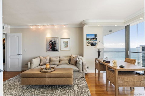 A unique opportunity to own one of the most sought-after floorplans at The Shores! Offering breathtaking views of the Pacific Ocean, Point Loma, and the San Diego skyline, this 3-bedroom Penthouse has gorgeous features like hardwood flooring, a custom maple wood kitchen with granite counters, a convenient layout with walk-in laundry room, and two parking spaces! El Encanto Tower has been recently remodeled and is situated at The Shores, next to the beach and the renowned Hotel Del! The Shores has 7 tennis courts, 2 pickleball courts, 4 oceanfront pools, a clubhouse for various events with a full bar and a fitness center with indoor jacuzzis and saunas! Come experience beach living at its finest!