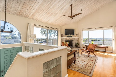 Fantastic location! Panoramic views sweep from snowcapped mountains to the coast, with westerly views of the iconic California sunset every night! This well-appointed 2 bed, 2.5 bath home with 1322 square feet of living area is 100% dialed in. The upgraded kitchen has white cabinets, quartzite countertops, gray subway backsplash, tile floors, stainless appliances, a bonus beverage fridge, a breakfast bar, and a garden window that overlooks neighboring treetops adding to the feeling of significant privacy. The dining and living areas have beautiful hardwood floors, and windows abound. A stacked stone gas fireplace graces the living room. The half bath up is adorned with wallpaper and new vanity. The two bedrooms down each have updated bathrooms. The doors and closets have been replaced with modern single panel doors. Central air and a new furnace were installed two years ago. There is a private patio to enjoy outdoor dining, and a nearby stairwell easily accesses the subterranean garage. In addition to two assigned parking spaces, the garage features a storage unit and additional guest parking. The gated community includes a sparkling pool and hot tub. The community is between Fairview Park and Vista Park and sits above the Talbert Nature preserve. There are miles of trails for walking and biking – all just minutes to the beach! There are so many pluses to this home you must see it to believe it!