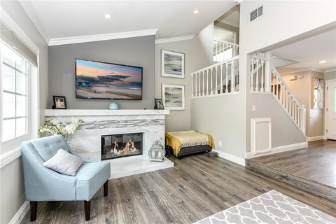 This fully remodeled Eastside townhouse is just jaw-dropping. An elevated entry welcomes you into this beautiful home with gorgeous grey, engineered hardwood floors, marble counters, vaulted ceilings, double pane french windows, crown & base moldings throughout, and the finest of finishes. Almost everything in this house has been redone in the last 3 years and not as a flip. You can tell the quality of work and care put into this property. The kitchen features entirely new, white cabinetry, marble counters, chic tile backsplash, recessed lighting, and crown molding. A dining area adjacent to the kitchen opens it up to the living room. The spacious living room has vaulted ceilings, recessed lighting, double pane french windows, contemporary marble and tile fireplace with mantel, and new french doors that lead to a generous patio deck and grassy area - perfect for pets. Downstairs you'll find a half bath for your guests. Upstairs are the 3 bedrooms all very spacious with large, double pane french windows, walk-in closets, and hardwood laminate floors. NO carpet! The master bath has beautiful porcelain tile floors, marble counters, new cabinetry, satin nickel finishes, dual sinks, and incredible closet space! The other 2 bedrooms are near master-size and connected with a Jack and Jill, fully upgraded with the same porcelain tile, marble counters, cabinetry and finishes, and a walk-in shower. A 2-car attached garage, new roof, and low HOA dues make this townhouse quite the catch!