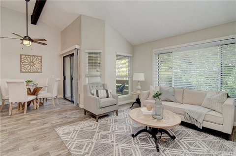Tucked quietly in the back of the resort-style community of Brighton Springs, your little slice of everyday paradise awaits. Surrounded by palms, well manicured landscape, flowing streams, creeks, a sparkling pool and spa is only the beginning for this home. You will love the oversized 2-car garage with separate doors, built-in cabinetry, and adjacent ample guest parking. Entering the unit, you will immediately take note of the wood-like tile that expands throughout. Almost the entire back wall of the living room and dining area features glass…from the slider that leads to the patio to the multiple living room windows that overlook greenery. You will love sitting on the patio and enjoying the outdoors by the way. Look up in almost every room and enjoy the tall vaulted and beamed ceilings. The white cabinets, gas cooktop, recessed lighting, and stone counters make this kitchen one any chef could love. Whether sitting on a stool at the counter or at the dining table, there are multiple options to enjoy a meal. Spacious primary suite boasts vaulted ceilings, a large walk-in closet, and ceiling fan. Primary bathroom conveniently offers dual vanity, tiled floors and a tiled shower. 2nd bedroom feels just as large as the primary. Plenty of room for a bed and additional furniture such as a desk and dresser. Double-door entry at the office room which can be utilized as a 3rd bedroom if preferred. Don’t forget about the hall bath with open wood shelves and white shiplap. Inside laundry behind accordion doors and overhead cabinets for linens and laundry supplies. Looking for even more storage? Pull the attic access down inside the master closet to reveal a pull-down ladder which leads you up to an amazing storage area. Fantastic location near some of the best shops and restaurants around on Harbor Blvd, The LAB, The Camp, and freeway access to the 55, 405, and 73. You’ll have to see this home for yourself! Dare to compare. Come check it out, you’ll be glad you did! This home is on leased land and runs through the end of 2057.