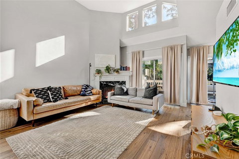 Absolutely stunning, beautifully upgraded Pentridge Cove luxury condo. This model-perfect 2 bedroom, 2 bath home with a 2-car garage, boasts new central air conditioning, soaring cathedral ceilings, newer rustic hardwood flooring, high transom windows for lots of natural light, raised panel interior doors, fresh designer paint, high baseboards, and dual pane windows with custom casements. Homeowner's currently use garage as a home office equiped with WiFi! The elegant living room showcases a granite fireplace with handcrafted wood surround and mantel. The remodeled kitchen is a Chef's delight with Quartz countertops, subway tile backsplash, coffered ceiling, recessed lighting, extra large sink, designer faucet, electric range, dishwasher, stainless microwave and counter-depth refrigerator. It has a lovely dining room that is open to both the kitchen and living room and sliding glass doors leading to an serine oversized deck/balcony/patio that overlooks the streams and tropical forest trees - such a tranquil place to relax and entertain! The spacious primary suite with cathedral ceiling has his & hers mirrored closets and an upgraded bathroom that includes dual sinks, a soaking tub, and a separate shower with tile surrounds, mosaic tile inlay, and a clear glass shower door. The secondary bedroom is adorable with bead board wainscoting, a delightful window seat, cathedral ceiling, and mirrored closet. There is also a convenient inside laundry closet and an upgraded electrical panel. Pentridge Cove is a highly desired community with resort-style pool and spa. It is walking distance to restaurants, pubs, coffee shops, and boutique shopping at both The Lab and The Camp. It is also very close to South Coast Plaza, Segerstrom Center for the Arts, and white sand beaches. Immerse yourself in the allure of this remarkable home and embrace a lifestyle defined by beauty, tranquility, and convenience.