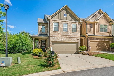 Stunning end unit located in sought after Park Place at Hampton! This home is spotless and barely lived in since built in 2017. This townhome includes a nice side yard and beautifully landscaped backyard. Also includes a front porch as well as a bay window off the Dining Area, that are only available in a few units in the subdivision. Meticulously maintained interior with oversized master. Large loft with spacious secondary bedrooms, updated light fixtures. New LVP flooring in kitchen with extra padding and waterproofing. Upgraded dishwasher, gleaming granite countertops with island. Close to GA 400 outlet mall and all new shops and restaurants.