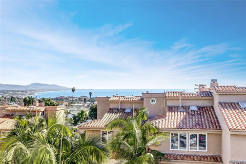 Sweeping ocean, coastline, white water and city lights views from this stunning turnkey residence. Located in gated Point Vista this light, bright and breezy home features a dual master set up, an abundance of living space and a sizeable wrap around patio yard. Enter from the welcoming tile staircase to a small foyer that divides the ocean view living from the dining room and kitchen. With two walls of windows, all with plantation shutters, an ocean view deck and ample space the living room is a great place to relax or entertain. Large enough to possibly allow for a second more casual space, in addition to your dining table, the dining room has great light, a fireplace and patio access. Stylishly updated the kitchen features granite counters, upgraded cabinets, stainless steel appliances including a 5 burner gas stove, a microwave, refrigerator and dishwasher and a patio view bay window. Just off the dining room the patio has ocean views near the front and multiple entertaining spaces. Upstairs there is a small landing with a desk that leads to the expansive master suite which has vaulted ceilings and a breathtaking panoramic view deck. The updated master bath features a dual sink vanity, skylights and a large soaking tub with shower. Beyond the master is the second bedroom which has great light and an ensuite bath. All of this and a 2 car garage. This home is walking distance to beaches, world class resorts, shopping, dining and entertainment in Downtown Dana Point.