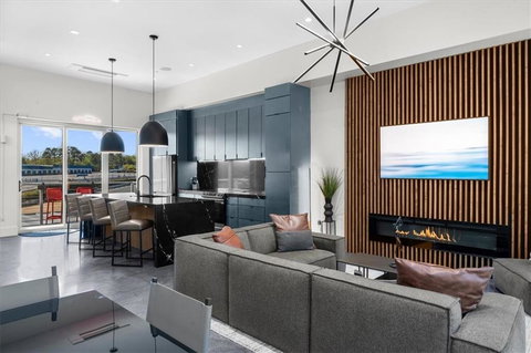 On the upper level, the living space was designed to entertain. A bold chef’s kitchen anchors the home with a waterfall island, stainless steel appliances, and custom finishes that balance edge with sophistication. The open-concept layout flows seamlessly to your private balcony overlooking the track, where the sights and sounds of the circuit become part of your everyday experience.