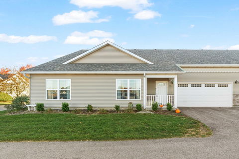This beautifully designed townhome features mostly main floor living with 2 first floor bedrooms, 2 full bathrooms, pantry, and laundry all within reach. Enjoy the comfort of a heated 2-car garage, a The second floor offers an extra bedroom or storage room for added versatility. Thoughtfully designed with 36" wide doorways throughout, this home is wheelchair accessible. The spacious, open-concept great room features vaulted ceilings, creating a cozy space for family gatherings. With easy parking access and modern comforts, this home offers both functionality and style. HOA includes lawn care and snow removal.