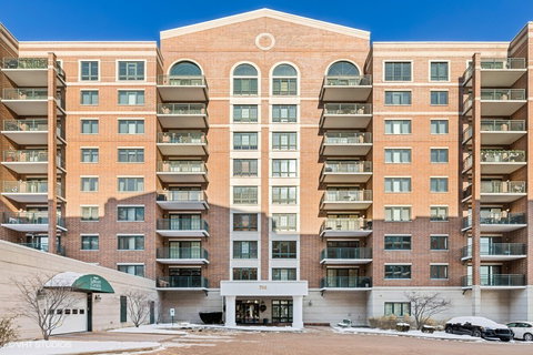 WOW...Is how you feel when you step inside this penthouse unit with over 2400 square feet of gracious living! The roomy foyer with a huge walk-in closet are provided upon entering. There are nine foot ceilings throughout with four stunning floor to ceiling Palladian windows, two with sliding doors to private balconies. The spacious living and dining rooms offer a wonderful space for entertaining. There are ample cabinets and counter space in the eat-in kitchen which overlook the living/dining areas. Enjoy the skyline views from the large balcony off the living room. Open the French doors from the living room into the 3rd bedroom or den, a wonderful space for relaxing! The expansive en suite provides a large walk-in closet, bath with whirlpool tub, separate shower and double bowl vanity. Have your morning coffee or watch the sun set from your private balcony. The second bedroom is spacious and also works well for a home office. A large functional laundry room with plenty of space for storage cabinets is ideal. There is a lovely full bath off the hallway to service guests. Two tandem indoor spots in the lower level and a storage unit are included. This is a fabulous unit, nothing like it and located in the heart of town. Just two blocks to the Metra, library, shopping and the newly renovated Des Plaines Theatre with live entertainment. Enjoy carefree living in this well maintained building!