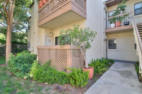 Location, Location, Location! This gorgeous ground level, end unit with newly installed recessed lighting in kitchen and fresh paint throughout is in a prime location where both bedrooms are back to large lawns, matured trees and open canyon with views to enjoy; no stares from neighbors! Open kitchen with large granite counter bar. Nice sized dining room with large pantry. Living room with cozy fireplace opens to a patio yard, looking out to its beautiful landscaped surroundings. Master bedroom with large walk-in closet. Spacious secondary bedroom has over-sized closet and direct access to the hall bathroom. Wood laminate floors throughout. Only few steps to your carport with no steep stairs to deal with. Wonderful association pool, spa, club house and tennis court for your all-year round fitness. Across from golf course and close to parks, shopping, freeways, and colleges. Don't Miss Out!