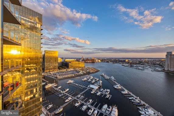View from a modern balcony overlooking a city skyline and waterfront, with visible dining area indoors.View ListingMLS ID #MDBA2146722
