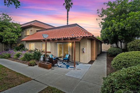This rare ground level end unit is Move-In Ready with its own private patio! Enjoy the comfort of central A/C, a great layout, and spacious bedrooms. This perfect starter home has been freshly painted, offers upgraded kitchen and bathrooms, and includes in unit stackable washer & dryer. Benefit from energy-efficient dual-pane windows and two assigned parking spaces. Relax in the community pool area and take advantage of the central location with easy freeway access. The home is within walking distance to downtown El Cajon, parks, schools, and bus lines. Situated in a smaller, gated complex. VA Approved!