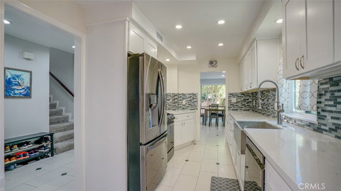 The dining area features a custom-built buffet with a quartz countertop, ideal for entertaining. The remodeled gourmet kitchen impresses with white shaker, soft-close cabinetry, quartz counters, a sleek designer backsplash, and an ultra-stylish cement sink.