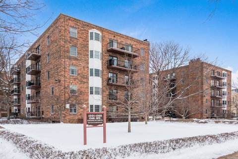 Best unit in this highly sought-after elevator building! Bright top floor SW corner with lovely views of St Mary's and the rose garden. Fantastic location steps from downtown Evanston. DEWEY school district. And all those features you're looking for: huge balcony, central air, in-unit side by side laundry, & owned on-site parking (garage + exterior spot). Over-sized living room with gas fireplace & sliding doors to south facing balcony. Dining room with plenty of space for a v large table--great for entertaining. Updated & highly functional kitchen with Decor / Miele stainless steel appliances, Corian counters, and breakfast bar. Very large master suite with walk-in closet. Well-sized 2nd bedroom with large closet. 3rd bedroom currently set up as a den & open to living room, but could easily be made back into a bedroom. Updated baths. Surround sound in LR, den & 3rd bed. Additional storage on same floor. Professionally managed building with solid reserves.