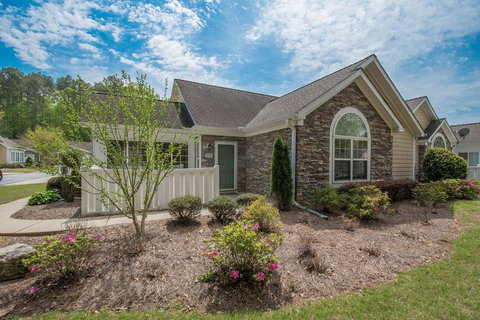 You do not want to miss this beautiful condo in the highly sought after 55+ community of The Villas at Gingercake. You will have more time to enjoy entertaining in this open concept floor plan because your HOA maintains the grounds and exterior of your home. This charming home features a stone front accent loaded with curb appeal. Enter the home to be greeted by gleaming hardwood floors and generous windows that provide natural light making the home bright throughout. Pair the loads of natural light with the high ceilings and this home feels bright, open, and makes the large rooms feel even more spacious. Enjoy an open floor plan perfect for entertaining and a true ranch for convenience. The family room offers a charming corner fireplace and plenty of space to unwind. The kitchen provides plenty of storage space with white cabinets, granite countertops, and a tile backsplash. Both bedrooms are spacious and have private bathrooms with granite and tile upgrades. Enjoy the outdoors with an open air patio. This community is conveniently located near local restaurants, shopping, and the hospital. The Villas at Gingercake has a clubhouse, pool, and gym for you to enjoy!