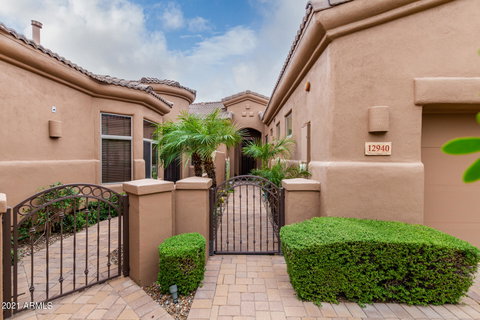 A rare opportunity, perfect for a winter visitor or permanent residence. Walking distance to the World-Famous Fountain, restaurants, & shopping. This gated single level home with an oversized 2 car garage is move in ready. Inside you'll find 2 bedrooms, 2.5 baths with an elegant interior. Featuring an open living room, along w/ a dining area separated by a cozy fireplace & back patio access w/ serene mountain views. The large open kitchen comes complete w/ granite countertops, custom back splash, SS appliances, & a high-top breakfast bar. Main bedroom enjoys a private patio exit, walk-in closet & bath with dual sinks, & glass shower, while the en suite 2nd bedroom combines a large walk-in closet & private full bathroom. The lovely backyard offers mountain views & a screened covered patio.