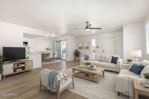 Move-in ready with VIEWS in the heart of Fountain Hills! All the remodeling has been done for you--featuring brand-new flooring, a beautifully updated kitchen with quartz countertops, and new appliances, INCLUDING an in-unit combo washer/dryer (a rare find, as most units rely on a shared laundry room). The HVAC and water heater were replaced in 2017 and recently serviced and flushed within the past 3 months. Perfect as a second home or starter property. Located on the second floor with no neighbors above. Includes 3-sided covered parking and a private storage closet.