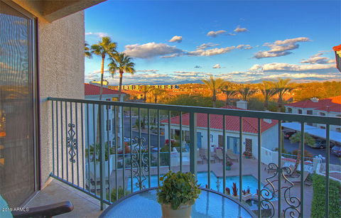 WOW!!! PENTHOUSE VIEWS! ELEVATOR! Center of town! End Unit! If you want relaxed, lock & leave, Fountain Hills living with sweeping views & walking distance to Fountain Park, restaurants, library, community center & all of Fountain Hills' events then this is for you! PENTHOUSE living -- across from elevator! No steps needed! This property will WOW you from the first look! You'll enjoy sweeping views of Four Peaks, Red Mountain and more from this perch! This light & bright unit has granite in the kitchen, two large bedrooms, split floorplan & lots of storage. Can come furnished with dishes, linens, etc so you just need to bring your toothbrush & start enjoying! Community has partially heated pool, hot tub, clubhouse & exercise rm & happy hour every Thurs! RARE find! View before it's gone!!