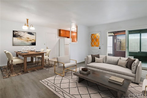 Tucked away on in interior street is where your single level, cottage awaits! It's the perfect place to settle after downsizing or to start your home-ownership. As you enter you will gaze upon an open floor plan covered in new luxury vinyl plank flooring that allows the living room, dining area and kitchen to flow seamlessly together. Fresh, white walls are ready for your decorating and personal style to come to life! The enclosed patio provides more space for work or play. Relax and unwind under the covered patio in the private backyard trimmed with a garden with colorful flowers. Look a little closer and you'll find this to be detached, with no common walls. The AC unit will keep you cool all summer long. The 2 car garage makes parking a breeze, has laundry hook-ups and adds extra storage space. The community offers its residents resort-quality amenities including a sparkling pool, spa and tennis courts. Two blocks from Mile Square Park, minutes from an abundance of shopping and dining options and freeways. World class beaches, Disneyland, Knotts Berry Farm and so much more are close by to enjoy. Don’t let this opportunity pass you by!
