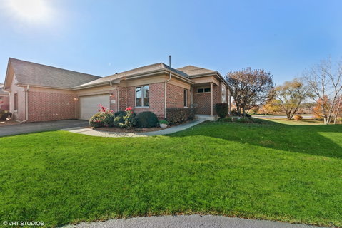 Spacious end unit ranch townhome located in Frankfort's Walnut Creek. This home has 2 bedrooms and 3 full bathrooms, den/office and sunroom off the patio. Large open living room/dinning room space with 3 sided fireplace and vaulted ceilings. Full finished basement with plenty of storage and an option to make an additional bedroom.