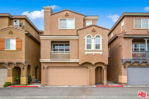 Move-in Ready, updated 2005 townhome in gated planned community well-positioned near conveniently located guest parking. The home boasts high ceilings, loads of natural light, a well-positioned balcony, laminate wood flooring, recessed lights and an open floor plan. You will love the layout of this residence; at entry level there is a primary suite w/access to your enclosed backyard and a separate inviting entry so perfect for your use as a bedroom or as an office or guest space. The main level includes a spacious living room & den area open to a dining area w/an upper level balcony and view of entrance to the community; guest bath is also conveniently located on this level; enjoy cooking and entertaining in an updated kitchen w/lots of counter space and a lot of wood cabinets & storage space, a double sink w/elegant Palladian windows, stainless steel refrigerator, white microwave, stove & dishwasher and a closeted laundry w/washer and dryer and convenient shelving; the breakfast bar/island is adjacent to the dining area that is open to the den and living room an ideal open floor plan. In the living room there is a contemporary fireplace with a stone hearth. High quality laminate wood flooring throughout; Two spacious bedrooms are on the upper level; a spacious 2nd primary suite has a ensuite bathroom with a double sink and tub/shower combination; guest suite on same floor w/full bath. Air conditioning and central heating. Low homeowners association fees and a conveniently located gated community just off the 110 freeway. Two-car attached garage w/room for storage; a gated backyard w/patio and grassy area are perfect for outdoor entertaining or relaxing outdoor space for you to enjoy. Low low HOA fee and conveniently located guest parking near the townhome. A great buy for a new owner seeking a more recently built home in a great community.