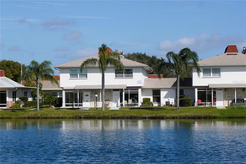WATERFRONT, Don't miss this opportunity to own a stunning 2-bedroom, 1.5-bathroom townhouse in the GATED 55+ community of Tahitian Gardens. This townhouse comes fully furnished and ready to move in, with the largest floorplan in the community and amazing WATER VIEWS. You will love the elegant tile floors, the custom wood cabinets, the stainless-steel appliances and the stone counters in the kitchen and bathrooms. The living and dining area is spacious and bright, with oversized windows that let in natural light. The master bedroom has a large closet and a beautiful view of the lake. The half bathroom is conveniently located on the first floor, while the main bathroom has a walk-in shower. There is also a large capacity washer and dryer for your convenience and a newer HVAC system. Relax on your patio and watch the birds and wildlife as you enjoy the lake views and the sunset. The heated swimming pool is just a short walk away, along with many other amenities such as shuffleboard, arts and crafts, bicycling club, bingo, dominoes, card groups and more. The community is well-maintained and secure, with easy access to shopping and public transportation. Tampa and Clearwater airports are less than an hour away. You can also walk to CVS, Walgreens, and Aldi, or drive a few minutes to Tarpon Springs, the Sponge Docks, and Howard Park beach. This townhouse is sold as is for owners’ convenience. Schedule your appointment today to see this gem.