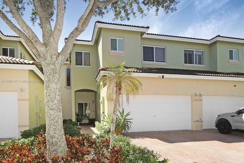 This stunning townhome features open floor plan cathedral ceilings, impact windows & sleek zebra blinds that enhance the modern aesthetic. Tile floors throughout the home, offering both durabiity & style, while the kitchen boasts S/S appliances. A unique catwalk on second floor leads to the spacious master suite, complete w/private balcony & an ensuite bathroom featuring his-&-her sinks, walk in shower & tub. guest bedrooms share a convenient Jack & Jill bathroom. Back patio w/ stamped concrete is perfect for relaxing or entertaining. Additional features incl. a 2 car garage, laundry room & association fee covers AT&T U-verse internet, DirectTV cable, community pool, landscape, maintenance & roving security, ensuring a worry-free lifestyle. PROPERTY LOCATED IN X FLOOD ZONE.