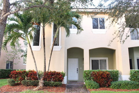 Located in the gated Cali Greens community, this corner townhome has 3 bedrooms, 2.5 bathrooms, and a 1-car garage. This home comes equipped with hurricane-resistant windows and an alarm system. The open-concept kitchen includes stainless steel appliances and granite countertops. The large patio is paved and gated, and the home has a one-car garage and a spacious two-car driveway. All bedrooms are located upstairs, which also includes a full bathroom, a laundry room with washer and dryer and a large landing area. The main bedroom includes a walk-in closet and boasts a large en-suite bathroom with his and hers vanities, and a large tub and shower. The HOA covers high-speed internet, lawn maintenance, pest control, a community pool, 24-hour security and gated access