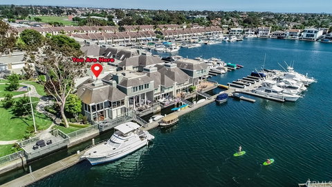 HUNTINGTON HARBOUR WATERFRONT TOWNHOUSE w/60' deeded deepwater boat dock & ramp to your home! What a RARE FIND for boat enthusiasts! 180-degree water-frontage w/LONG CHANNEL & SUNSET VIEWS from both floors! You may watch the boat parade from your patio, or walk out your back door to your yacht (not included). Ideal location w/no one above or below & only attached on one side. Other side has another private gate that allows you entry from the greenbelt. QUIET, END UNIT in gated community of Tennis Estates. 1 pool, spa, clubhouse, lounge area, basketball hoop, 2 lighted tennis courts & private marina! Front AND back patios make this property great for entertaining, & the back one overlooks the sandy beach of Humboldt Island! Kitchen has new granite counters & backsplash. Living room has remote controlled shades & fireplace w/wood storage. Den is being used as a 3rd bedroom w/ cozy sitting area that's perfect for the book lover to sit & enjoy the wood burning fireplace! A good size shower is in the downstairs bathroom as well! Master has motorized shades & feels like a cruise ship on the ocean! Master bath skylight gives great natural light while you bathe in your jetted jacuzzi tub! 3rd bath upstairs has beautiful natural wood ceiling encasing a circular skylight, that gives you that nautical feel. Guest bedroom upstairs has lovely view of greenbelt, mature trees & walking paths! 2-car garage! HOA pays dock electricity, maintenance, water & trash. Hurry!This one's a winner!