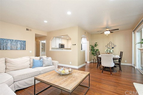 Situated in the coveted guard-gated community of Pacific Ranch awaits the opportunity to own this elegantly remodeled condo! This gorgeous ground level end unit has been extensively upgraded with rich wood floors, 5" baseboards, dual pane windows, and custom window shades throughout. Enter the open living area with recessed lighting centered around an exquisite stone fireplace. The dining area showcases a sliding glass door to the first of your two brick patios. This entertainers kitchen boasts white cabinetry, quartz counters, Frigidaire stainless steel appliances, 6 burner range, stainless steel sink, recessed lighting, and open sight lines into your living area. Double doors lead to your spacious master bedroom which includes a walk-in closet with built-in storage and access to your second patio. The newly remodeled en suite bathroom offers quartz counters, dual Kohler sinks, frameless glass shower doors, contemporary subway tiled shower, and bluetooth speaker. The guest bedroom is well sized and also offers built-in storage in its' closet. The guest bathroom is remodeled with quartz counters, combination soaking tub with shower, subway tile, and glass shower doors. Additional features include indoor laundry, single car garage, and a carport. Pacific Ranch is a luxurious community with pools, spas, clubhouse, and stunning landscaping. Conveniently located close to the beach, Pacific City, shopping, dining, and award winning schools. This property is a must see!
