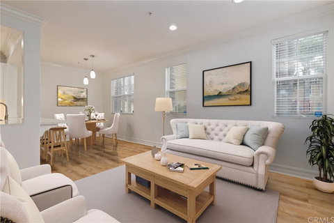Embrace beach living in this gorgeous corner unit townhome that is only a short bike ride to the beach! Imagine yourself sitting on the front porch, drinking in the idyllic coastal climate and enjoying serene greenbelt views all year long. As you enter you will gaze upon a light and bright open floor plan adorned with new flooring, crown molding, recessed lighting and built-ins. The living room, dining area and kitchen flow seamlessly together for ease of daily living. The kitchen has been remodeled to feature crisp, white cabinetry and quartz counters, stainless steel apron sink and appliances, recessed lighting and an eat-at counter. When the weather needs a little assistance, the central AC with WiFi thermostat will do the trick. Dual owner's suites with upgraded bathrooms and walk-in closets fitted with custom shelves and drawers. The laundry is upstairs too. The tankless water heater will help keep money in your pocket. The attached two car garage with full 2-car driveway makes parking a breeze and adds extra storage space. Close to downtown and blocks from Seacliff Village, Huntington Beach High School and several parks. Quick freeway access will make commuting a breeze. To see it is to love it!