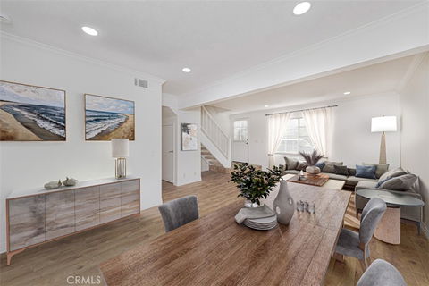 Upon entry, you’re welcomed into a bright, open living area that flows naturally from the living room into the dining space, highlighted by crown molding and wood flooring.