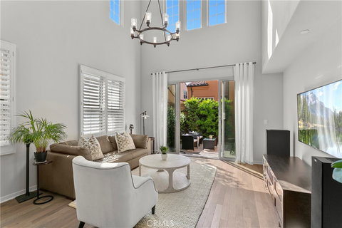 Nestled in the prestigious neighborhood of Portola Springs, this highly upgraded detached condo is the epitome of modern design and features the convenience of a coveted downstairs bedroom with a full bathroom and a two-car attached garage. The kitchen boasts a generous island with bar seating, luxurious quartz countertops, upgraded cabinetry, and a top-of-the-line Bertazzoni range. Natural light abounds in this open and spacious floor plan, which connects seamlessly to a private enclosed courtyard. This outdoor oasis includes a custom fireplace, outdoor lighting, and professional landscaping, ideal for relaxation and entertaining. Two additional ensuite bedrooms upstairs and a large loft area offer a versatile space for a TV room or a home office. Additional designer upgrades include real wood box shutters, ceiling fans, wood flooring, upgraded carpet, ceramic flooring in the bathrooms, and designer paint throughout. Enjoy the lifestyle in this prime location, with top-rated schools nearby and access to community amenities such as pools, spas, a clubhouse, parks, a putting green, BBQ area, tennis and basketball courts, and playgrounds. This home truly offers the perfect blend of luxury, convenience, and modern living in one of Irvine's most desirable communities.