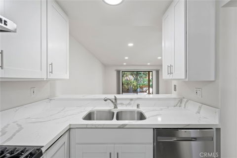 Nicely updated, lower level, 1 bedroom 1 bath condo is situated in one of the more private and serene locations in the community of Orange Tree. Upon entering, you are welcomed by vinyl plank wood-like flooring and the freshly painted interior. The living room has recessed lighting and opens to a private patio with creek views. The kitchen has been upgraded with newer shaker cabinetry, stunning quartz counters, and stainless steel appliances. Refrigerator, washer, dryer, and dishwasher all included. The bathroom has also been remodeled with newer vanity, flooring, counters, and fixtures. The over-sized bedroom has great light and a large mirrored closet. Extra storage in the hallway. Close proximity to the pool! HOA Amenities Include Dedicated Carport Parking, Community Pool/Spa, Basketball Court, Tennis Courts, Playground, Gym, Clubhouse, and a Picturesque Lake that Runs Throughout the Community. Located in Irvine, Just Minutes from Multiple Parks and Shopping Centers. Short Walk to Irvine Valley College and Short Drive to Hoag Hospital, UC Irvine, Oak Creek Golf Club, Wild Rivers Water Park, Irvine Spectrum, and Santiago Canyon. Easy Access to the 5/405/133 Freeways and 241/261 Toll Roads.