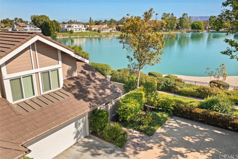 PRIME LAKEFRONT LOCATION with 270 degree LAKE VIEWS from the end of the lake to the Bridge!! Enjoy amazing sunsets from this elevated corner location with unobstructed lake views from both back and side yards, dining room, kitchen, family room, master bedroom and retreat. From the moment you enter the private gated courtyard and step into this beautiful home you know you're in a special place with water views all around. As you come through the entry, you enter the very spacious open living room featuring vaulted ceilings and a lovely chic fireplace. Just past the living room you'll see the charming dining room with lake views through the back and side French doors. The kitchen, which was beautifully remodeled in 2021, has a bay window overlooking the lake, a friendly breakfast counter, white cabinetry, quartz countertops, large pantry and new appliances including a 5 burner gas cooktop. Next to the kitchen is a breakfast nook which opens to the back patio and a large family room with built-in cabinetry. Upstairs, the oversized master suite has soaring ceilings, a lovely lake view and a private retreat (also with a water view) perfect for your morning workout, a private office or reading room. The recently remodeled private master bath has a very large glass enclosed shower in Italian ceramic and two individual sink vanities. This meticulously maintained home is flooded with natural light and has numerous upgrades such as remodeled bathrooms, plantations shutters installed in 2020, upgraded French doors, slider doors and Dual Pane Windows throughout. Then when you step out to the back yard, you are surrounded by the beauty of the lake all around. The backyard features many patio areas perfect for entertaining, Al-Fresco dining or just to restore and relax on your own in your beautiful surroundings. And of course, the many features of this Woodbridge community include the Tennis center and lagoon just steps away, plus swimming pools, parks and recreation of all kinds. This is a very special home in a very special place.