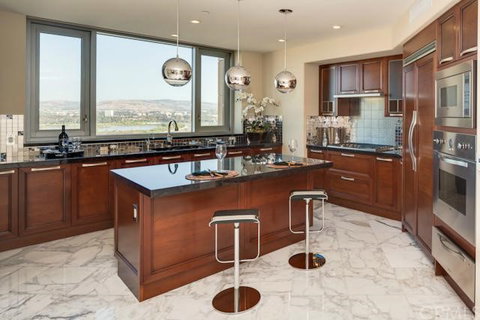 Highly upgraded and beautifully finished 12th floor penthouse style home with fantastic views of the nature reserve and Saddleback Mountain. High end ultra modern appointments throughout the home with Carrara marble floors in entry and living areas, stainless like Porcelenosa tiled backsplash throughout the kitchen, all Viking appliances inclusive of a floor to ceiling wine cooler, automated shades, oversized flat panel TV with surround sound, highly upgraded custom tiled onyx master bath with TV in mirror, custom closets and so much more. Enjoy resort style amenities that include a 5000 sf fitness center with gym grade equipment, steam rooms, cabana lines Jr. Olympic Pool with lap pool, two resident lobbies, conference and business center, 24 hour lobby attendants and more. Centrally located in the heart of the Irvine business district bordering Newport Beach. Close to South Coast Plaza, Fashion Island and beaches. Lease rate includes most utilities, cable and internet.