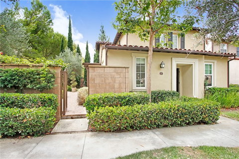 backyard with a lovely water fountain and full grown olive trees, cypress trees.