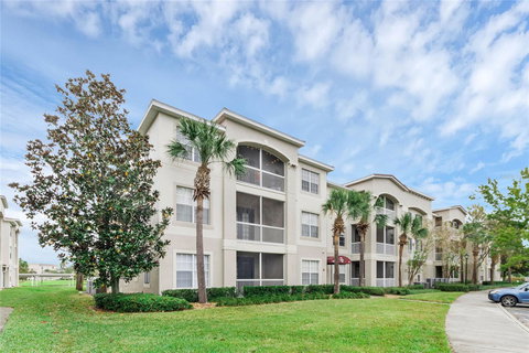 Welcome to a slice of paradise in this lovely updated condo. Not only do you have a split floor plan, providing privacy, there is an office, which could also be used as a fourth bedroom/nursery just off the primary bedroom. The bamboo floors offer a touch of elegance throughout the living room, hallways and kitchen. The kitchen has been updated and has plenty of counter space, including an island/bar area perfect for a quick snack or to keep the cook company. The Dining room is spacious and will accommodate a table seating of 8. The pond and pool views from the private balcony are gorgeous and relaxing, with the Disney fireworks lighting up the sky just for you! This home sits on the top (third) floor, is a corner/end unit and close to the community pool. For those days when you don't need to get any extra steps in, an elevator takes you right to your front door. No short term rentals are permitted, so you wont have to