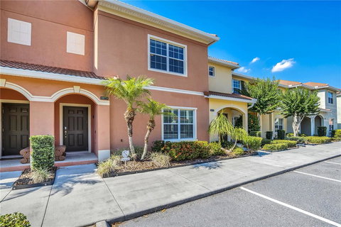 EXTENDED DECK! BEATITFUL HOME WITH VINYL PLANKS. Don't miss this great opportunity! 4 Bedrooms 3 baths townhome with private pool. With 1 Master Suite, this is the perfect home to buy. Clubhouse with pool, spa, game room, fitness center, movie theater, tennis and basketball courts, playground. Paradise Palms Resort is zoned for short-term or long term rental just minutes from Disney parks and restaurants.